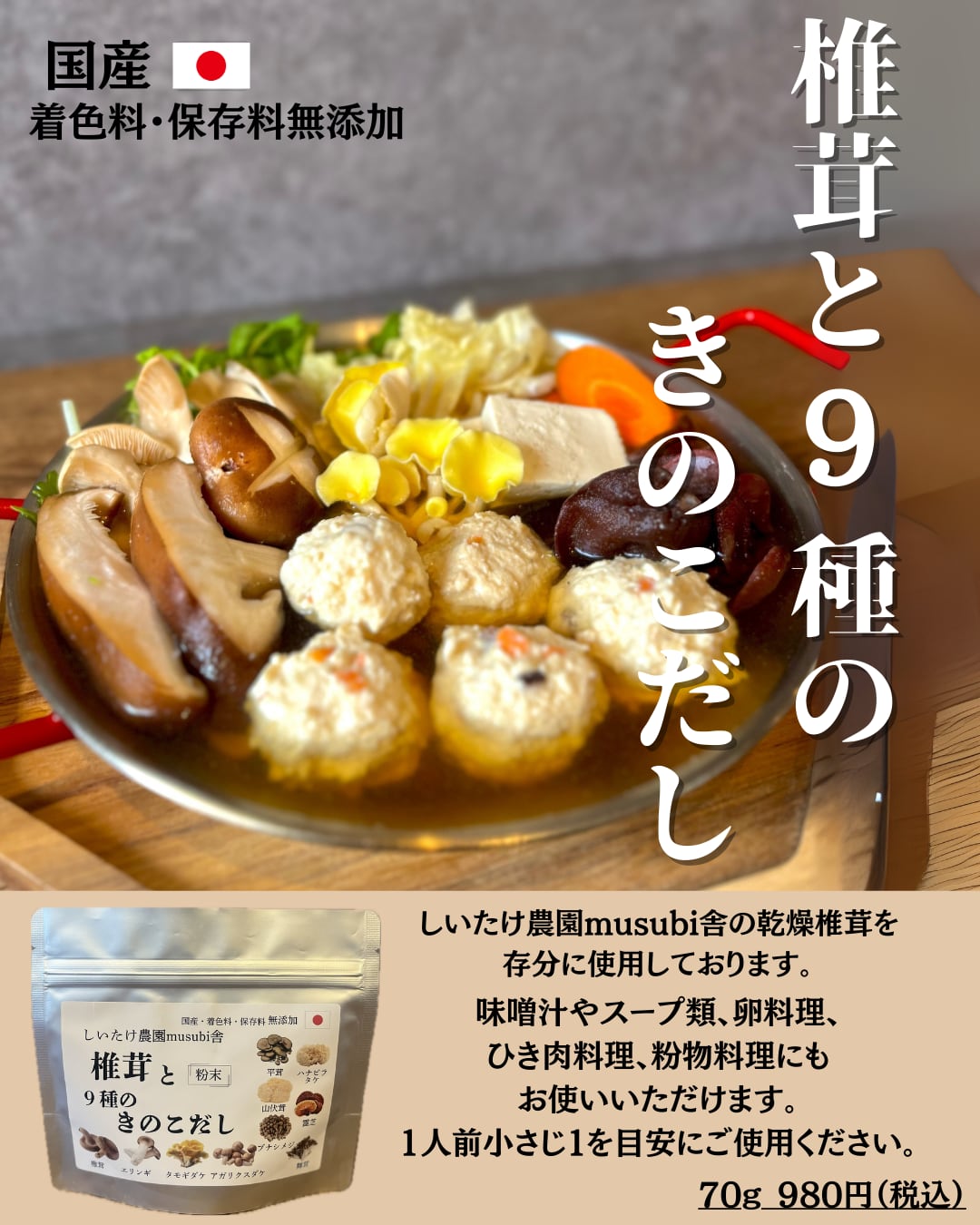 より素材にこだわる方に向けてリニューアル致しました。 椎茸と9種類のきのこを配合した風味豊かな粉末だしです。自然の旨味を楽しみながら、美容と健康のサポートをします。